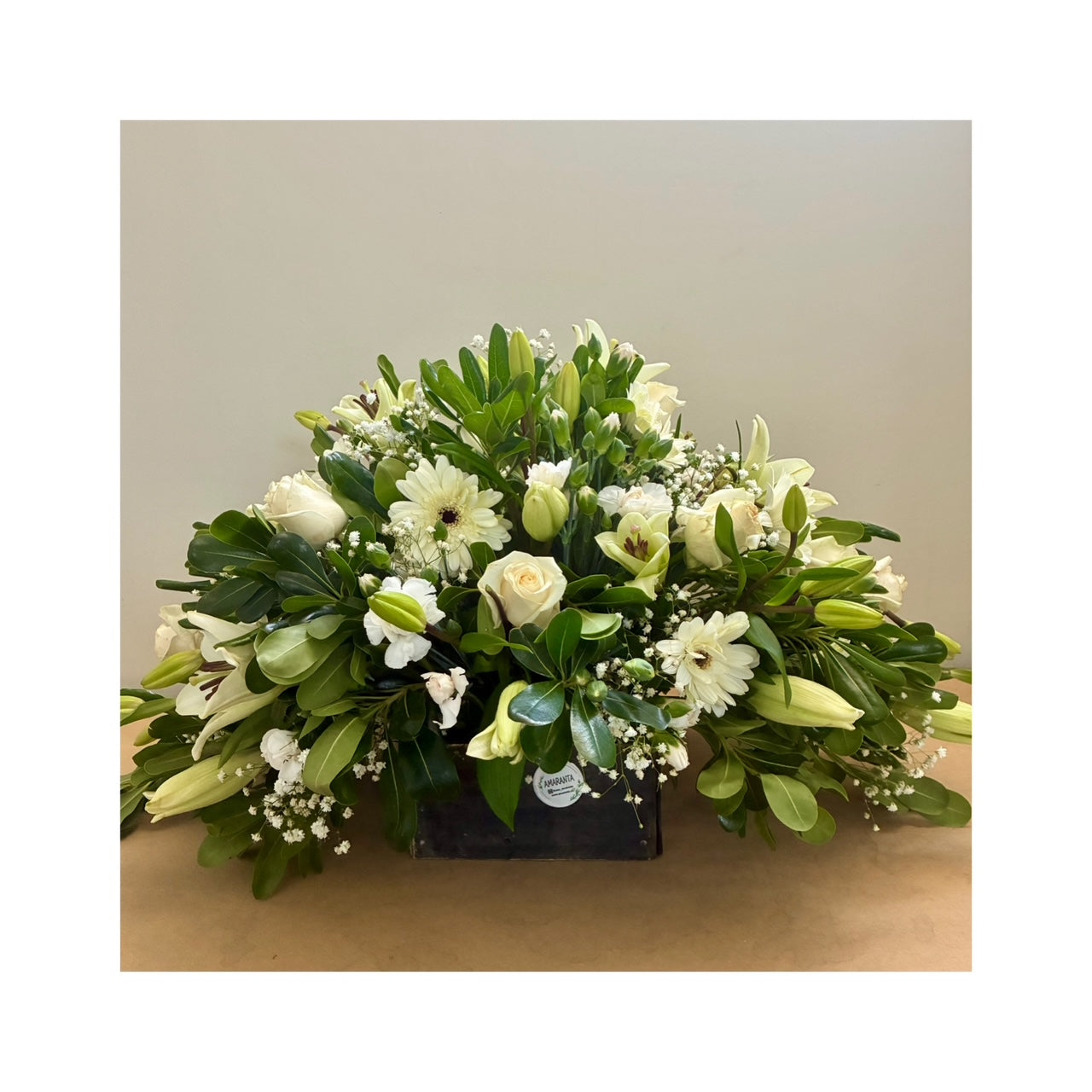 Lindo arreglo en forma ovalada compuesto de rosas , gerberas y lilium con follaje en bandeja de madera.