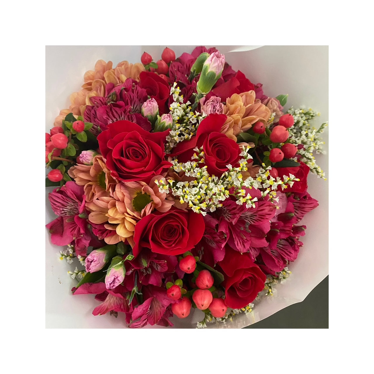 Precioso ramo en tonalidades donde destaca el color rojo , con rosas e hypericum rojos y otras flores que dan una armónica y elegante composición.