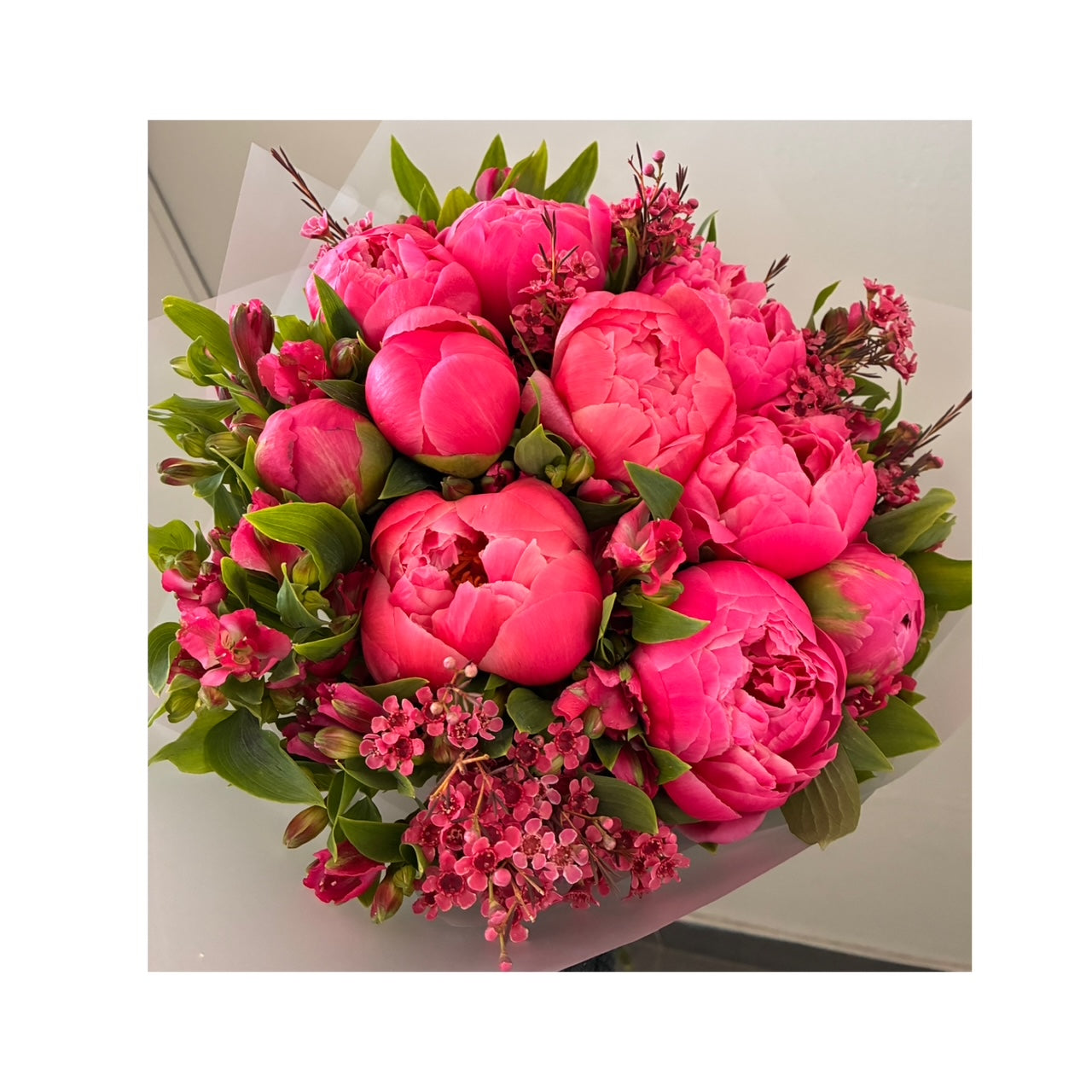 Maravilloso ramo de 10 varas de Peonías con wax o limonium y complementos.